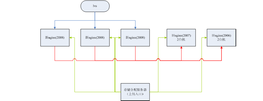 按之前的計劃,分成兩個組,一組服務器用lvs 做負載均衡負責新圖片;另一組服務器做舊圖片訪問和備份。新圖機器找?guī)着_好點的服務器,SCSI 硬盤;舊圖機 器沒太大要求,PC 機就行,找夠硬盤就可以,現(xiàn)在IDE 的1T 硬盤也不太貴,最好再搭個raid 就省事了,最主要是這些機器要多。如下圖:
