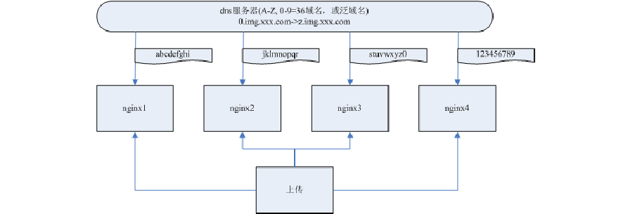 這個架構圖分了36個域名,圖片文件名是用md5值起的,在md5值中取一位字母就可以表明它是在哪個域名里,域名就對應了機器,上傳分發(fā)的時候也是根據(jù)此字母來分發(fā)。