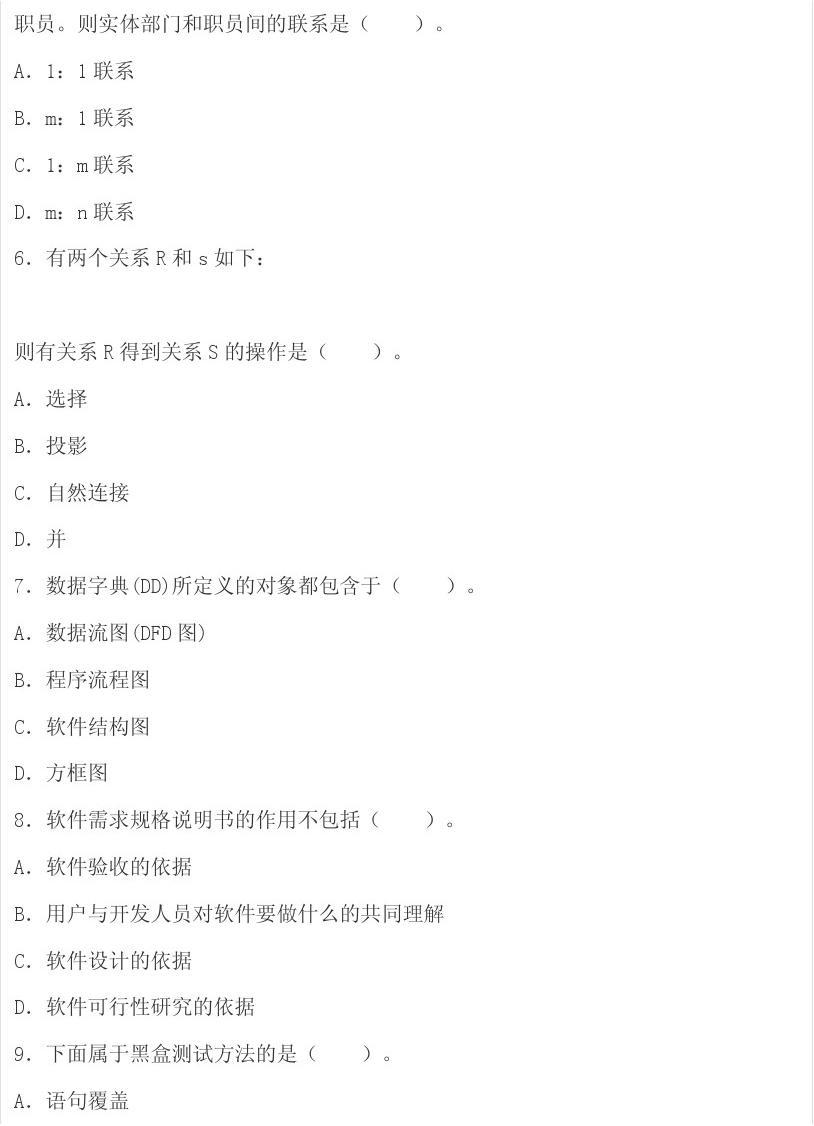6.A 【解析】由關(guān)系R 到關(guān)系S 為一元運(yùn)算,排除C 和D 。關(guān)系S 是關(guān)系R 的一部分,是通過(guò)選擇之后的結(jié)果,因此選A 。