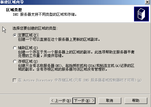 步驟1:在上面圖2“DNS 服務(wù)器控制臺”窗口中,右擊“正向查找區(qū)域”文件夾,在彈出快捷菜單中選擇“新建區(qū)域”命令,彈出“新建區(qū)域向?qū)А睂υ捒?,單擊“下一步”按鈕,彈出“區(qū)域類型”對話框,選擇“主要區(qū)域”,如圖3所示。