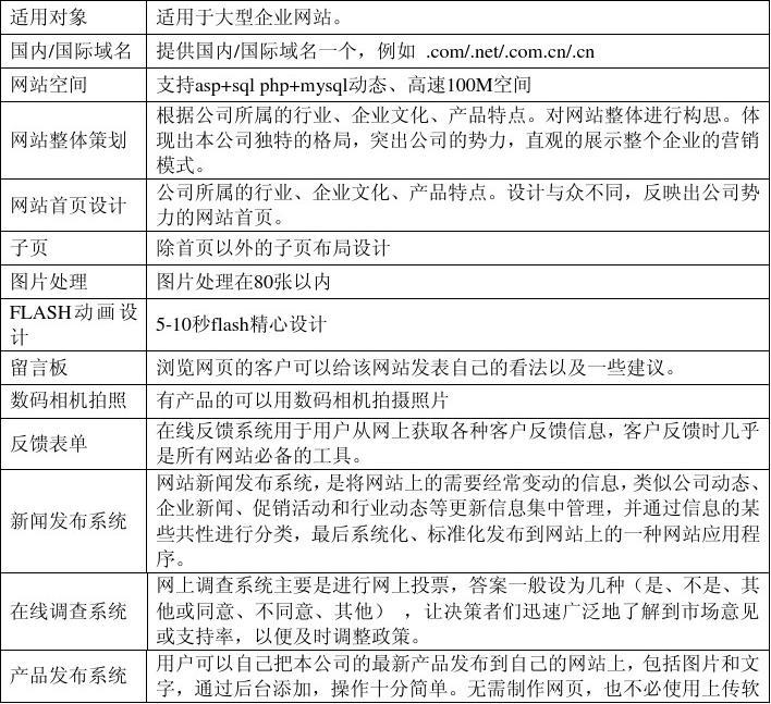 動態(tài)網(wǎng)站價格表 標(biāo)準(zhǔn)型網(wǎng)站套餐特點: 適用于中小型企業(yè)建立不僅要求優(yōu)秀的網(wǎng)站形象設(shè)計,還要求網(wǎng)站為瀏覽者提供豐富內(nèi)容,并且方便管理更新的網(wǎng)站, 頁面設(shè)計精美,帶后臺管理,可展示企業(yè)各類信息,企業(yè)介紹,