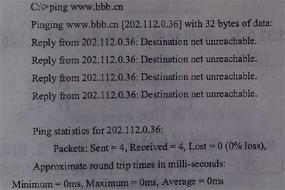 ●在某臺(tái)主機(jī)上無法訪問域名為www.bbb.cn 的網(wǎng)站,而局域網(wǎng)中的其他主機(jī)可以訪問,在該主機(jī)上執(zhí)行ping 命令時(shí)有如下所示的信息: