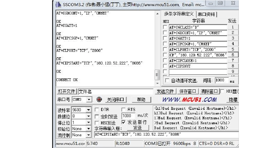 這幾條指令前面已經(jīng)介紹過,用于設置移動臺類別、連接方式、接入點和附著GPRS 業(yè)務等。起到一個前期準備的作用。之后,發(fā)送AT CLPORT="TCP","2000",設置本地TCP 連接端口為2000,然后發(fā)送:AT CIPSTART="TCP","180.120.52.222","8086",建立TCP 連接,連接到IP :180.120.52.222,連接端口為:8086。等待TCP 連接成功建立,模塊返回:CONNECT OK。