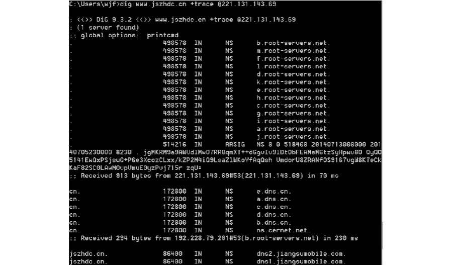 C:Userswjf>dig www.jszhdc.cn trace @221.131.143.69