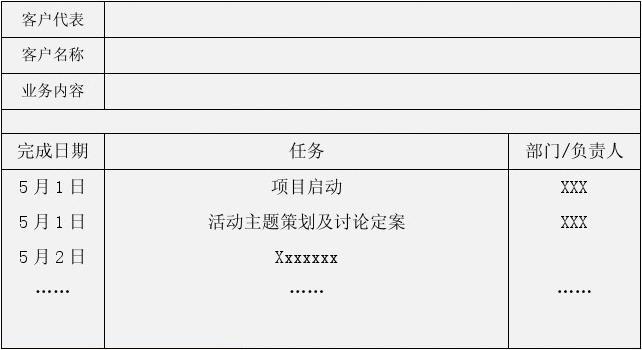 a. 與客戶積極溝通,確定客戶的切實(shí)需求,以便切題展開工作 b. 確定“完成日期” “工作任務(wù)” “負(fù)責(zé)人”