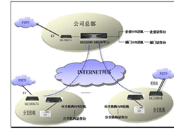 企業(yè)、部門和分支機構可以采用MG3000-T4或Mg3000-R 與PSTN 互通。