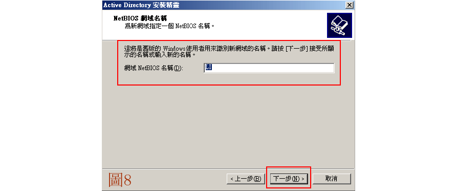 這裡是指定NetBIOS 名,注意千萬(wàn)別和下面的用戶端衝突,也就是說(shuō)整個(gè)網(wǎng)路裡不能再有一臺(tái)PC 的電腦名叫“AD ”,雖然這裡可以修改,但個(gè)人建議還是採(cǎi)用默認(rèn)的好,省得以後麻煩。在這裡我們不要修改NetBIOS 名稱,直接點(diǎn)擊下一步(圖8)