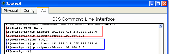 ip helper-address 192.168.1.4 \\配置DHCP 中繼代理,DHCP 服務(wù)器是192.168.1.4