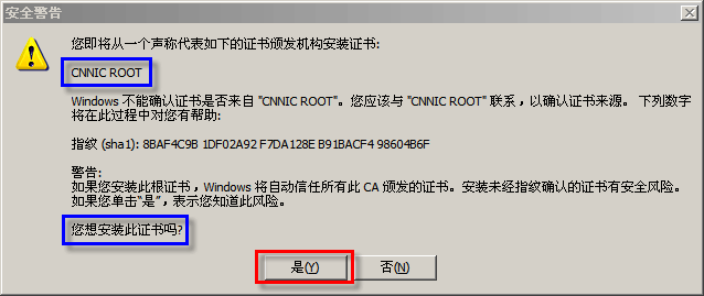 如果在導(dǎo)入證書過程中系統(tǒng)出現(xiàn)警告提示,請(qǐng)選擇肯定的答復(fù)是,如下圖示: