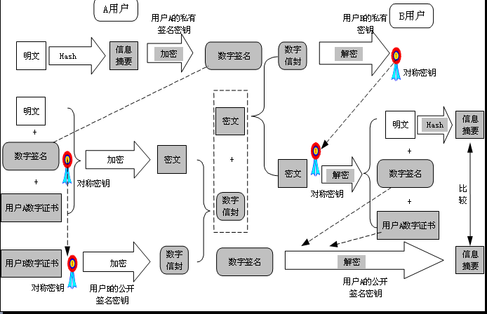 ①數(shù)字簽名:是通過一個單向函數(shù)對要傳送的報文進行處理得到的用于認(rèn)證報文來源并核實報文是否發(fā)生變化的一個字母數(shù)字串。作用是數(shù)據(jù)完整性,不可否認(rèn)性,身份真實性; ②數(shù)字信封:是用加密技術(shù)來保證只有規(guī)定的特定收信人才能閱讀通信的內(nèi)容; ③數(shù)字摘要;