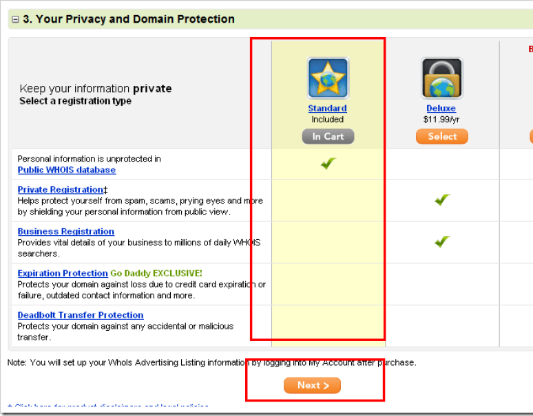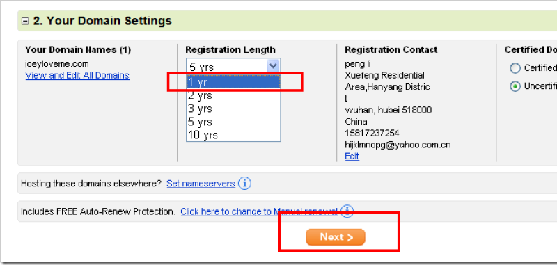 由于我之前已經(jīng)注冊并登陸,所以這里顯示我的域名注冊信息,點擊下一步