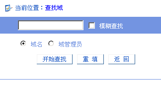 如不選擇“模糊查找”為精確查找,選擇則為關(guān)鍵字查找,即查找含有文本輸入框內(nèi)內(nèi)字符的域名或域管理員。