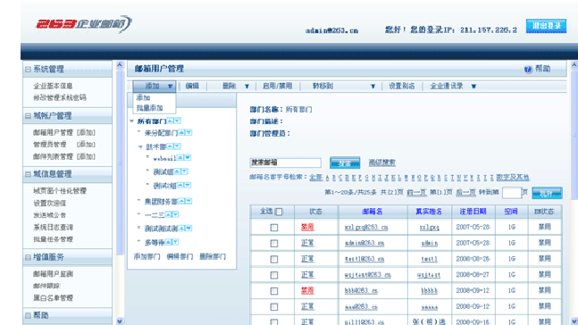 點(diǎn)擊左側(cè)菜單<域帳戶管理>下的<郵箱用戶管理>,進(jìn)入郵件用戶列表頁面,如圖5,可以對域內(nèi)所有郵箱用戶進(jìn)行添加、修改刪除等管理操作。