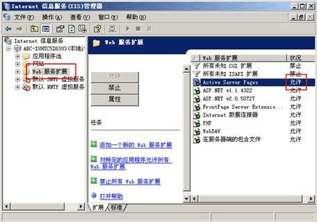 2、由于IIS 6比IIS 5多了一個WEB 服務(wù)擴(kuò)展控制,如果沒有設(shè)置正確,ASP 等??其他腳本網(wǎng)頁也是無法正常顯示的。雙擊Web 服務(wù)擴(kuò)展,然后在Active Server Pages(即ASP )上點擊鼠標(biāo)右鍵,選則< 允許 >。