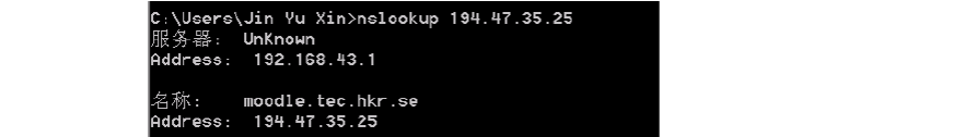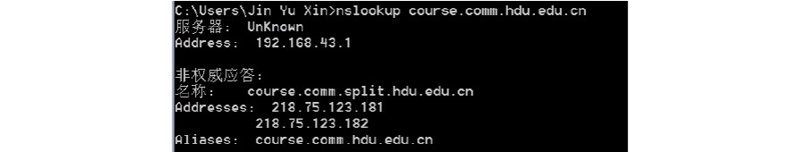 ,Type the commands “nslookup 192.168.156.101” and “nslookup course.comm.hdu.edu.cn”, and capture the output, as I did and showed below:
