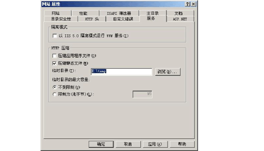 HTTP 壓縮是在Web 服務(wù)器和瀏覽器間傳輸壓縮文本內(nèi)容的方法。HTTP 壓縮采用通用的壓縮算法如Gzip 等壓縮HTML 、JavaScript 或 CSS文件。壓縮的最大好處就是降低了網(wǎng)絡(luò)傳輸?shù)臄?shù)據(jù)量,從而提高客戶(hù)端瀏覽器的訪(fǎng)問(wèn)速度。 使用方法是,右擊“網(wǎng)站”->“屬性”,選擇“服務(wù)”。在“HTTP壓縮”框中選中“壓縮靜態(tài)文件”,“臨時(shí)目錄”建議單獨(dú)設(shè)置另一個(gè)盤(pán)的目錄下。