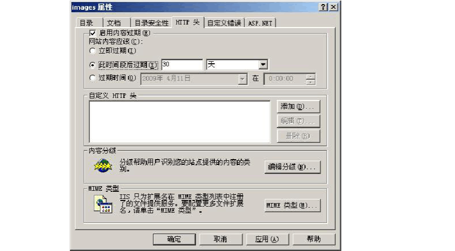 對(duì)于靜態(tài)文件啟用內(nèi)容過(guò)期可以提高訪(fǎng)問(wèn)性能。首先網(wǎng)站的目錄要?jiǎng)澐趾侠?,圖片、CSS 、JavaScript 均放在單獨(dú)目錄下,然后在IIS 中選擇目錄,點(diǎn)屬性-HTTP 頭,啟用內(nèi)容過(guò)期,可以選擇30天后過(guò)去,這樣,用戶(hù)瀏覽器將比較當(dāng)前日期和截止日期,以便決定是顯示緩存頁(yè)還是從服務(wù)器請(qǐng)求更新的頁(yè),由于圖片、CSS 、JS 通常變化較少,因此基本上都從本地緩存讀取,從而加快顯示速度。