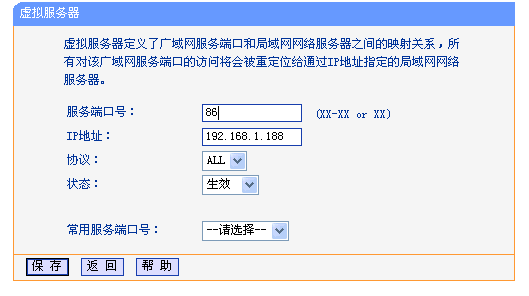 2、確定好路由器的地址,路由器的網(wǎng)關(guān)地址必須和設(shè)備的IP 地址在同一網(wǎng)段,如路由器的網(wǎng)關(guān)地址為192.168.1.1 。然后登入路由器在轉(zhuǎn)發(fā)規(guī)則—虛擬服務(wù)器,如圖所示