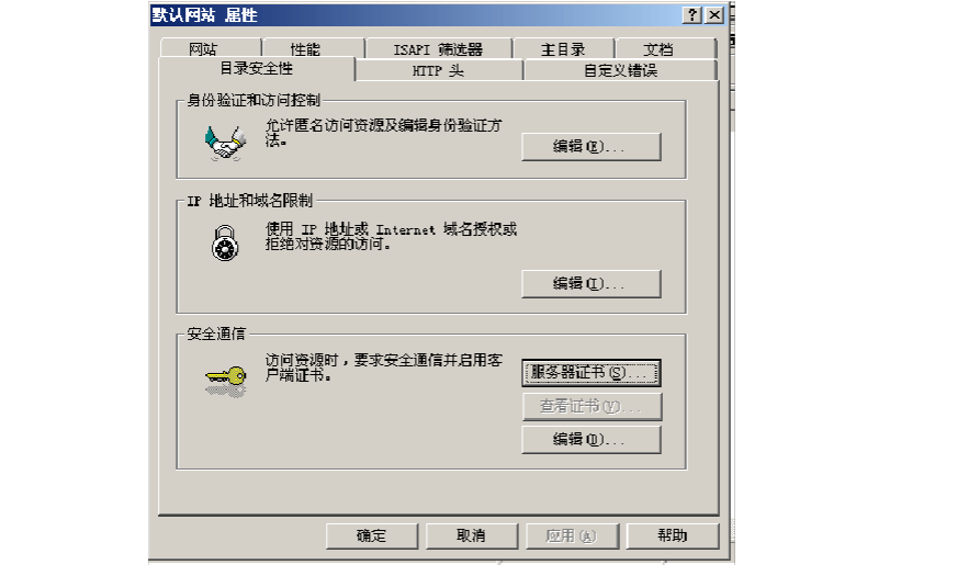 開始→管理工具→Internet 信息服務(wù)(IIS)管理器→網(wǎng)站→默認(rèn)網(wǎng)站→屬性→目錄安全性→證書服務(wù)器