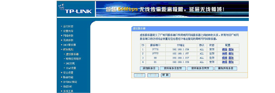 5、在右邊服務(wù)端口號中填“80”,IP 地址中填“192.168.1.157”,協(xié)議選擇“ALL”,狀態(tài)為“生效”,常用服務(wù)器端口號保持默認(rèn),點(diǎn)擊保存。