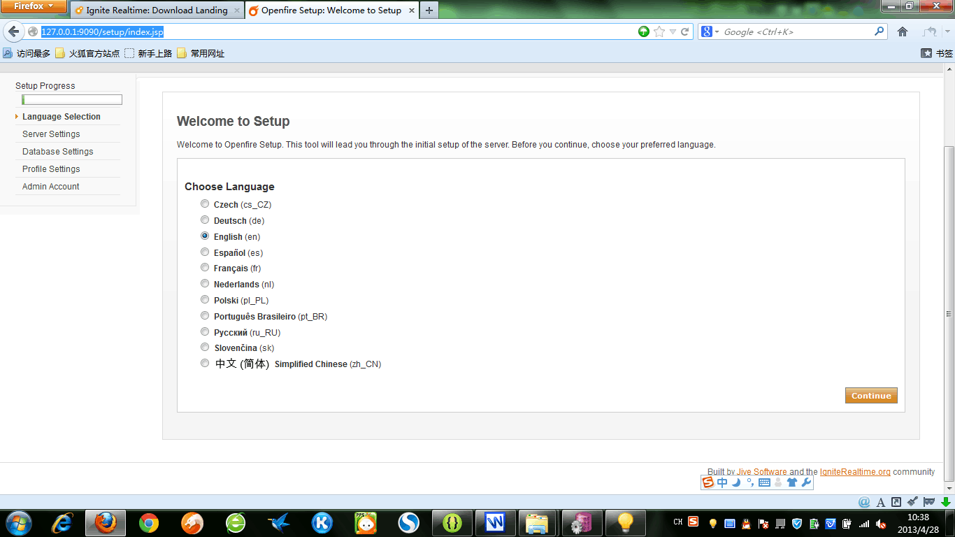 此時(shí),我們打開瀏覽器在地址欄中輸入url :http://127.0.0.1:9090/setup/index.jsp,即出現(xiàn)openfire 配置頁面首頁。如下圖: