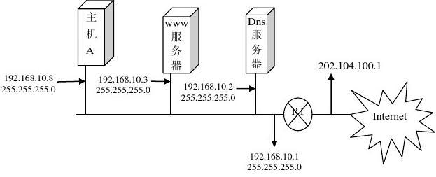 某公司的內(nèi)部局域網(wǎng)通過一路由器連接Internet ,并申請了一固定IP 202.104.10.1網(wǎng)絡(luò)結(jié)構(gòu)如圖所示,該局域網(wǎng)內(nèi)部有DNS 服務(wù)器一個,WWW 服務(wù)器一個。