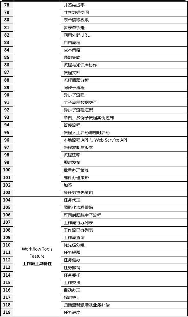 當(dāng)企業(yè)接入BPM 管理從建模到流程自動(dòng)化再到優(yōu)化過(guò)程,特性評(píng)估非常的關(guān)鍵,即買(mǎi)即用的特性指標(biāo)能夠規(guī)避在實(shí)施BPM 的風(fēng)險(xiǎn)成本。(下表序號(hào)無(wú)優(yōu)先級(jí),僅作為評(píng)估特性指標(biāo)的參考)