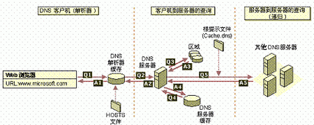 ,總之,DNS 的查詢過程按兩部分進(jìn)行:首選,名稱查詢從客戶機(jī)開始并傳送至解析程序(DNS客戶服務(wù)) 進(jìn)行解析; 其次,不能就地解析查詢時(shí),可根據(jù)需要查詢DNS 服務(wù)器來解析名稱。DNS 查詢的過程如下圖所示。