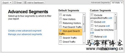 首先在Advanced Segments(高級(jí)細(xì)分群組)中選擇Non-paid Search Traffic,如下圖所示: