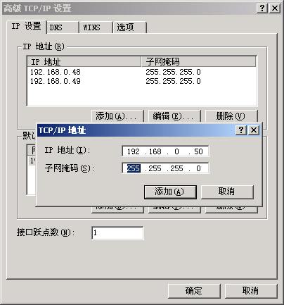 3、為網(wǎng)卡綁定更多的IP 地址:在上步中選“高級”,再選“添加”,然后輸入第二個IP 地址“192.168.0.49”,其相應(yīng)的子網(wǎng)掩碼“255.255.255.0”系統(tǒng)會自動填充;增加更多的IP 地址方法相同。如下圖: