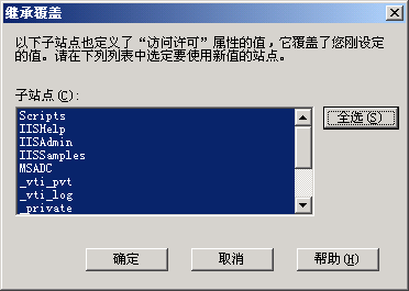 ⑸其它項目均可不用修改,直接按“確定”即可,這時會出現(xiàn)一些“繼承覆蓋”等對話框,一般選“全選”之后再“確定”即最終完成“默認(rèn)Web 站點”的屬性設(shè)置。如下圖: