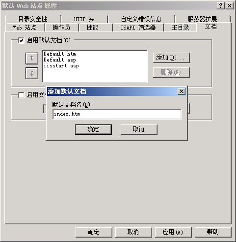 ⑷設(shè)置“文檔”:確?!皢⒂媚J(rèn)文檔”一項已選中,再增加需要的默認(rèn)文檔名并相應(yīng)調(diào)整搜索順序即可。此項作用是,當(dāng)在瀏覽器中只輸入域名(或IP 地址)后,系統(tǒng)會自動在“主目錄”中按“次序”(由上到下)尋找列表中指定的文件名,如能找到第一個則調(diào)用第一個;否則再尋找并調(diào)用第二個、第三個??如果“主目錄”中沒有此列表中的任何一個文件名存在,則顯示找不到文件的出錯信息。如下圖: