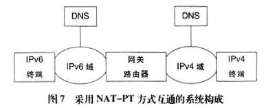 網(wǎng)絡(luò)地址轉(zhuǎn)換-協(xié)議轉(zhuǎn)換(NAT-PT )是一種純IPv4終端和純IPv6終端之間的互通方式,也就是說,原IPv4用戶終端上不需要進(jìn)行升級改造,所有包括地址、協(xié)議在內(nèi)的轉(zhuǎn)換工作都由網(wǎng)絡(luò)設(shè)備來完成。在這種情況下,網(wǎng)關(guān)路由器要向IPv6域中發(fā)布一個路由前綴Prefix ::/96,凡是具有該前綴的IPv6包都被送往網(wǎng)關(guān)路由器。網(wǎng)關(guān)路由器為了支持NA T-PT 功能,還具有IPv4地址池,在從IPv6向IPv4域中轉(zhuǎn)發(fā)包時使用。此外,網(wǎng)關(guān)路由器支持DNS -ALG (DNS -應(yīng)用層網(wǎng)關(guān)),在IPv6終端訪問IPv4終端的過程中發(fā)揮作用。采用NA T-PT 方式互通時的系統(tǒng)構(gòu)成如圖7所示。