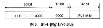 這是一種通過6over4隧道實(shí)現(xiàn)IPv4與IPv6互通的方式。在這種方式下,IPv4終端上要使用IPv4兼容IPv6地址,地址格式如圖3所示。其中,IPv4地址為全局惟一的IPv4單播地址。