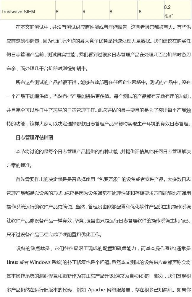 本文對(duì)七種不同的日志管理硬件和軟件解決方案進(jìn)行了分析,包括ArcSight Logger 4.0、GFI EventsManager v.8.2、 LogLogic MX3020 v.4.9.1、 LogRhythm LR2000-XM v.5.0、 NitroSecurity NitroView ESM and ELM v.8.4、Splunk 4.1.2和Trustwave SIEM。此次產(chǎn)品評(píng)估和分析的目的在于讓大家了解日志管理的特性和功能,包括什么功能可以區(qū)分不同解決方案。我們根據(jù)相同評(píng)估標(biāo)準(zhǔn)來為每個(gè)產(chǎn)品評(píng)分(1到10分,10分為最高分) ,這些產(chǎn)品都是互不相同的,屬于不同產(chǎn)品類別。