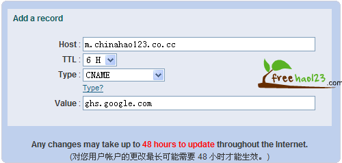 6、現(xiàn)在請(qǐng)把你要綁定的域名的CNAME 記錄修改為ghs.google.com (關(guān)于別名記錄的相差知識(shí)請(qǐng)新手谷歌一下,百度二下),如下圖: