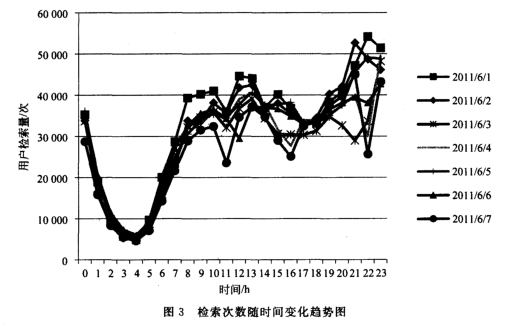 圖3顯示,不論工作日或節(jié)假日,每天21時、22時或23時是全天的最高峰,4時是全天的低谷。一天內(nèi),用戶檢索次數(shù)自4時開始增長,在上午10時達到第一個高峰,之后略有下降,后又緩慢增長,在12時或l3時達到第二個高峰,21時、22時或23時達到全天最高峰。這同人們的生活娛樂習(xí)慣是一致的,工作日內(nèi)10時是進行工作、學(xué)習(xí)的時段,節(jié)假日內(nèi)10時則是人們計劃娛樂的時段,這段時間人們需要檢索相關(guān)信息;12時或13時是午休時段,晚21時以后為睡前休閑娛樂時段,在娛樂時間往往會需要檢索相關(guān)信息。與文獻中互聯(lián)網(wǎng)搜索引擎用戶檢索時間進行對比,發(fā)現(xiàn)移動搜索引擎用戶訪問時間集中在休閑娛樂時段。