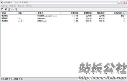 配額項:單擊這個按鈕可以打開配額項對話框,在這個對話框中,可以通過配置菜單分別定制每個用戶磁盤空間。也可以刪除老用戶空間配額限制。另外它的主界面就是一個用戶配額監(jiān)控器。如圖9: