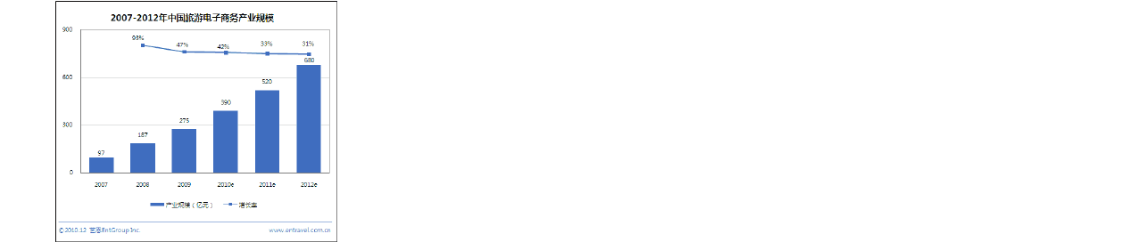 1)2010年中國在線旅游電子商務產業(yè)規(guī)模同比增長42。 2010年中國旅游電子商務產業(yè)規(guī)模達到390億元,相比2009年的275億元增長42,預計未來2年旅游電子商務市場的年增長率保持在30以上,到2012年市場規(guī)模有望達到680億元。