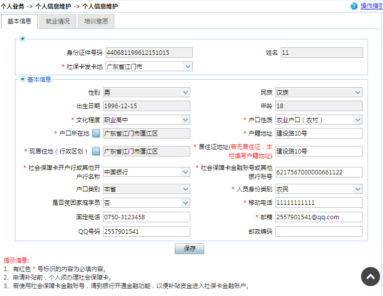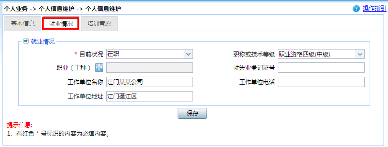 依次點擊“基本信息”、“就業(yè)情況”、“培訓(xùn)意愿”,錄入相應(yīng)信息(詳見下圖):