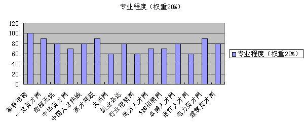 2009年通過(guò)國(guó)問(wèn)卷調(diào)查的方式,對(duì)國(guó)內(nèi)十多家有代表的招聘網(wǎng)站進(jìn)行了全面調(diào)查,通過(guò)對(duì)知名度、專業(yè)程度、客服態(tài)度、招聘效果和求職效果5個(gè)比較關(guān)注的問(wèn)題進(jìn)行了調(diào)查,結(jié)果顯示,知名度搞得網(wǎng)站不一定綜合得分就高,相反,一些深耕于某一細(xì)小領(lǐng)域的招聘網(wǎng)站反而得高分!其中指標(biāo)的權(quán)重如下:知名度15、客服態(tài)度15、專業(yè)程度20、招聘效果25、求職效果25。