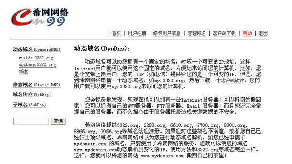 首先,因?yàn)樯暇W(wǎng)方式為ADSL ,IP 是動(dòng)態(tài)的,所以,我們要先弄個(gè)動(dòng)態(tài)域名,這里我推薦用希網(wǎng)的動(dòng)態(tài)域名,也有很多朋友用花生殼,相比免費(fèi)版的花生 殼,希網(wǎng)的免費(fèi)動(dòng)態(tài)域名多提供了一樣MX 記錄解析,而花生殼的MX 解析只有專(zhuān)業(yè)版的才提供,現(xiàn)在我們來(lái)申請(qǐng)希網(wǎng)的動(dòng)態(tài)域名。有固定IP 的朋友請(qǐng)無(wú)視這一 步。