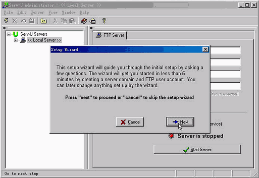 首先下載安裝Serv-U ,運(yùn)行,將出現(xiàn)“設(shè)置向?qū)А贝翱?,我們就?lái)跟隨著這個(gè)向?qū)У闹敢?,一步步進(jìn)行操作。