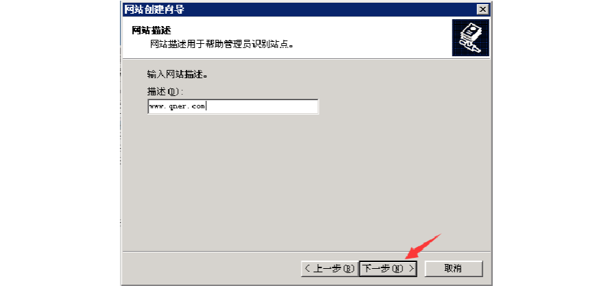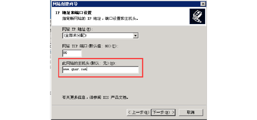 、“此網(wǎng)站的主機(jī)頭”,這個(gè)位置非常重要,就是你要你填上需要綁定的域名,一定不要弄錯(cuò)了喲,否則綁定會(huì)失敗的,繼續(xù)下一步!