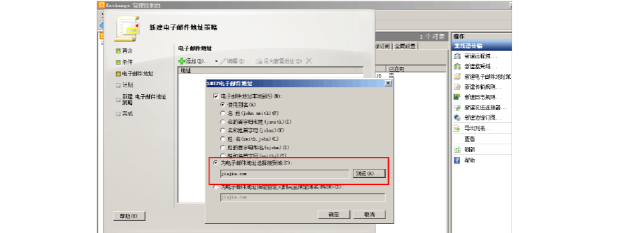 ,們有兩種方法為用戶的郵箱和這個(gè)新建的接受域做關(guān)聯(lián),一種是手動(dòng)為用戶添加額外的電子郵件地址。但這樣做非但工作量龐大,而且是不是顯得管理員太“笨”了,第二種就是利用exchange 強(qiáng)大的策略功能讓系統(tǒng)自動(dòng)根據(jù)策略為用戶添加jiejie.com 后綴域,本文要介紹的就是第二種。