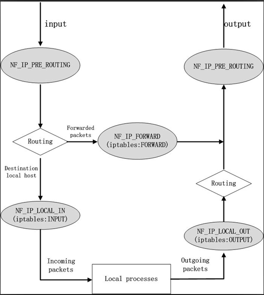 ,NF_IP_FORWARD、NF_IP_OUT_PUT、NF_IP_POST_ROUTING ,這5個(gè)hook 點(diǎn)分別對(duì)應(yīng)系統(tǒng)中默認(rèn)的5個(gè)鏈PREROUING 、INPUT 、FORWARD 、OUTPUT 、POSTROUTING ,iptables 依賴(lài)于這5個(gè)鏈進(jìn)行操作。如下圖所示: