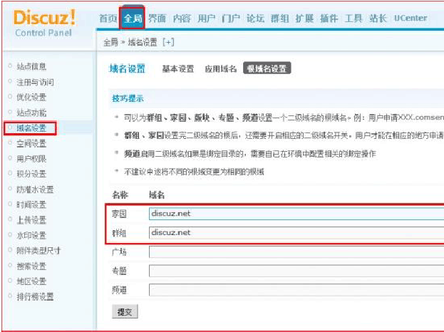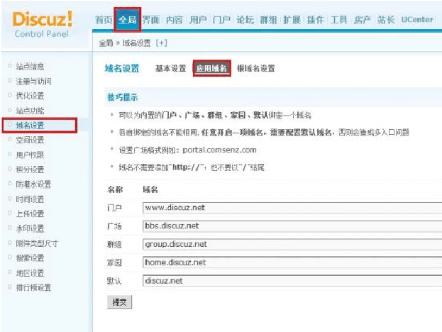 Discuz ! X1.5 提供了門戶、論壇、群組、家園、頻道、專題、論壇版塊、論壇分區(qū)、個(gè)人空間、單個(gè)群組的二級(jí)域名綁定功能