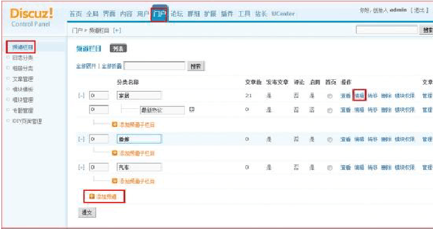 操作路徑:后臺(tái)--》門戶--》頻道欄目