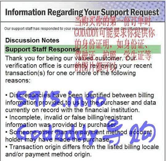 的)。你會在你的注冊郵箱里收到一封標題為:“Update [Incident ID: ××××××] - GoDaddy.com Order Verification Request - Action Required or Order may be Cancelled.”的郵箱,里面說的很多,中心就是為了安全什么什么的,要求你的政府發(fā)行的證件出示個GODADDY 驗證。證件包括不限于駕駛證、護照。你可以拍成照片用郵件回復過去。如果收到此封郵寄48小時內沒有提供證明,訂單會被取消,付款會打回到付款帳戶里,
