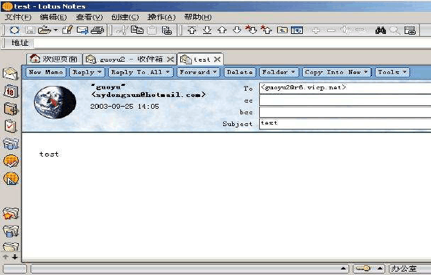 現(xiàn)在你可以通過其他郵件系統(tǒng)發(fā)送一封郵件到 Lotus notes 的郵件系統(tǒng)的 Internet 郵件地址,比如我就 用 sydongsun@hotmail.com 發(fā)送郵件到 guoyu2@r6.vicp.net,我用 Lotus notes 打開我的郵件,應該收到一份 來自 sydongsun@hotmail.com 的郵件。如所示